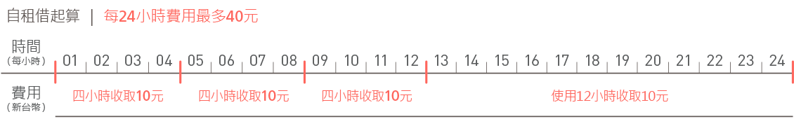 租金從租用時間開始起算;第1~4小時收NT10元,第5~8小時再收NT10元,第9~12小時再收NT10元,第13~24小時再收NT10元;每24小時最多收取NT40元,依此重複計算,惟每次借用最多不得超過5天。實際交易金額由各家銀行進行請款作業,消費者於當月信用卡帳單內將出現該次交易資料,如有任何問題,歡迎撥打0905472331(一般付費)洽詢。